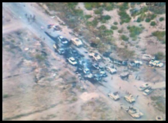 Ma l'ISIS non ha avuto pietà con l'Irak e con gli irakeni e non ne ha ricevuto alcuna: appena individuato il serpentone di veicoli i Mi-35, i Mi-28, gli Su-25 e gli F-16 di Bagdad hanno iniziato le loro incursioni sulla teoria di mezzi in fuga, trasformando la via verso la Siria in una nuova Autostrada della Morte.