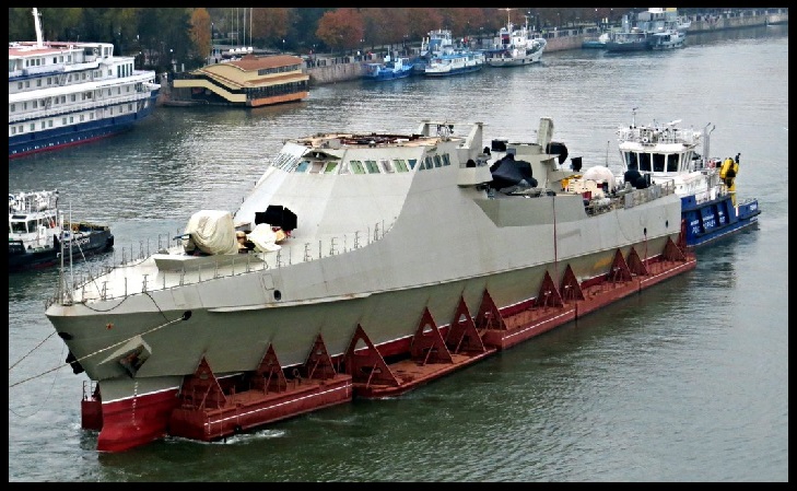 In queste foto si può vedere il trasporto dello scafo del pattugliatore della Marina Russa "Vasily Bykov" che, a bordo di una chiatta, attraversa le placide acque del Don a Rostov.